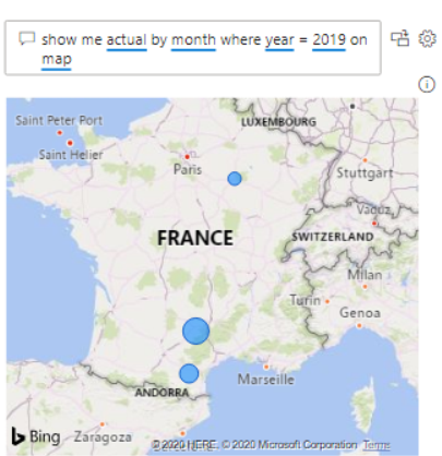 Običajno številske podatke prikazujemo z grafikoni. Za grafikone uporabljamo ukaze kot so on map, on line chart, on column chart, on bar chart. Da prikažemo zgornjo poizvedbo na zemljevidu uporabimo show me sales by month where year = 2019 on map.