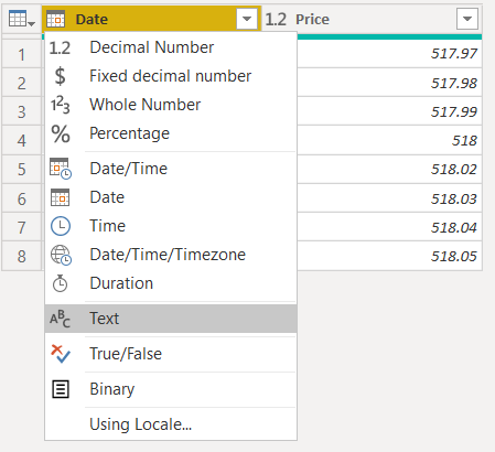 Datumski stolpec spremenimo v besedilo. Na stolpcu Date za tip izberemo Text.